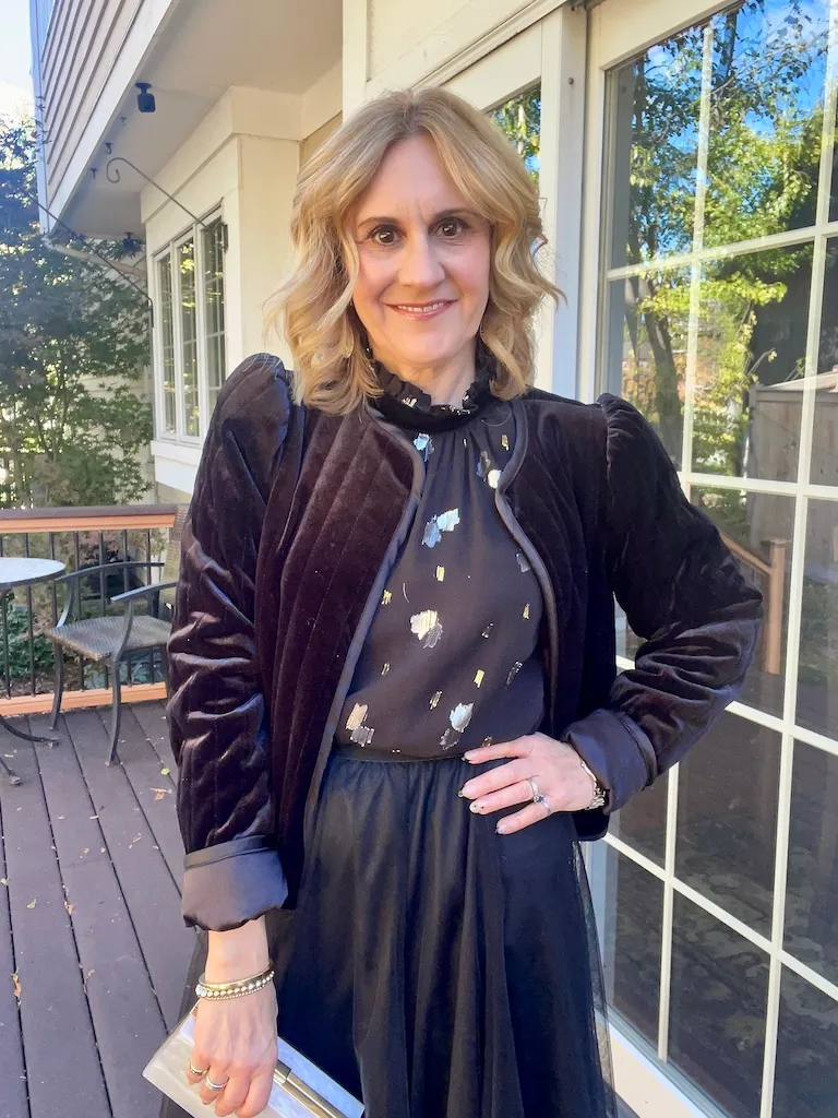 Create chic holiday looks with a sleek velvet jacket like this one. As the holiday season approaches, I love finding those special wardrobe pieces that can take me from a casual day out to an elegant evening affair. One of my favorite finds this year is this stunning Sanctuary velvet jacket found at a recent sidewalk sale. I got it for $20! Its soft texture, rich hue, and slightly structured silhouette make it the perfect piece to elevate any outfit. I’m showing two ways to style it — one casual and one dressy — to prove just how versatile velvet can be this season.