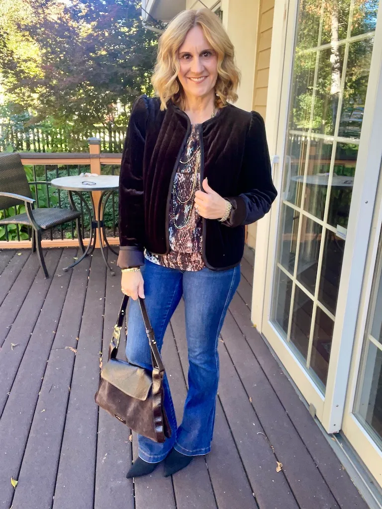 For a laid-back yet polished look, I paired the jacket with my Spanx flared jeans and a layered ruffled tank. While the jeans create a flattering shape with comfort, the velvet jacket instantly adds a dose of sophistication. This outfit is ideal for a casual holiday get-together, dinner with friends, or even a cozy date night. I finished the look with a structured bag, a layered necklace, and pointed-toe boots.