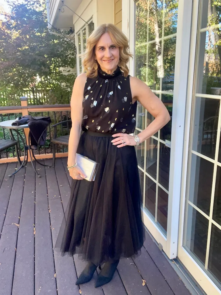 When it’s time to dress things up, this jacket transitions beautifully. I styled it with a tulle maxi skirt and an embellished tank. This creates a romantic and festive ensemble perfect for a holiday party or special event. Velvet, tulle, and a touch of sparkle give the outfit depth and drama without feeling over the top. A white clutch completes the look, keeping the focus on the luxe materials.