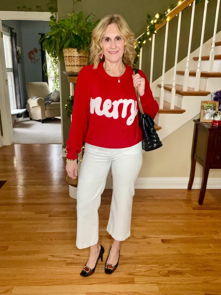 First up is the bright red Merry sweater, a returning favorite that still makes me smile. I dressed it up this time with a pair of crisp white cropped pants, creating a fresh, cheerful palette that feels perfect for holiday brunches or a casual get-together. A structured black handbag and polished heels elevate the look just enough, making this cozy knit feel unexpectedly chic.